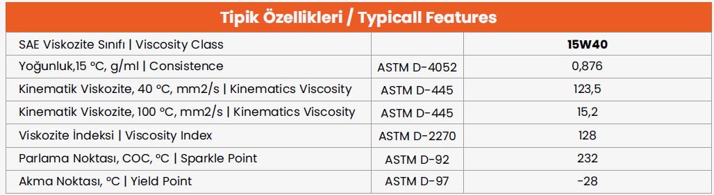 Birçok ticari araç üreticileri tarafından talep edilen yağlama gereksinimlerini karşılamak üzere formüle edilmiş, üstün kaliteli baz yağlarla viskozite geliştiriciler ve yüksek performans katkılarıyla harmanlanmış ağır hizmet dizel motor yağıdır. Dizel motorlar başta olmak üzere dizel motora sahip tüm kamyon, otobüs, tır, iş makinesi ve jeneratör uygulamaları için önerilir.